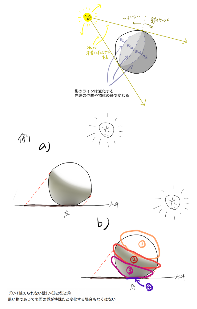 セオリーに従って影をつけるだけで、ある程度の不自然さを誤魔化したり、影で形を説明できるようになります。
